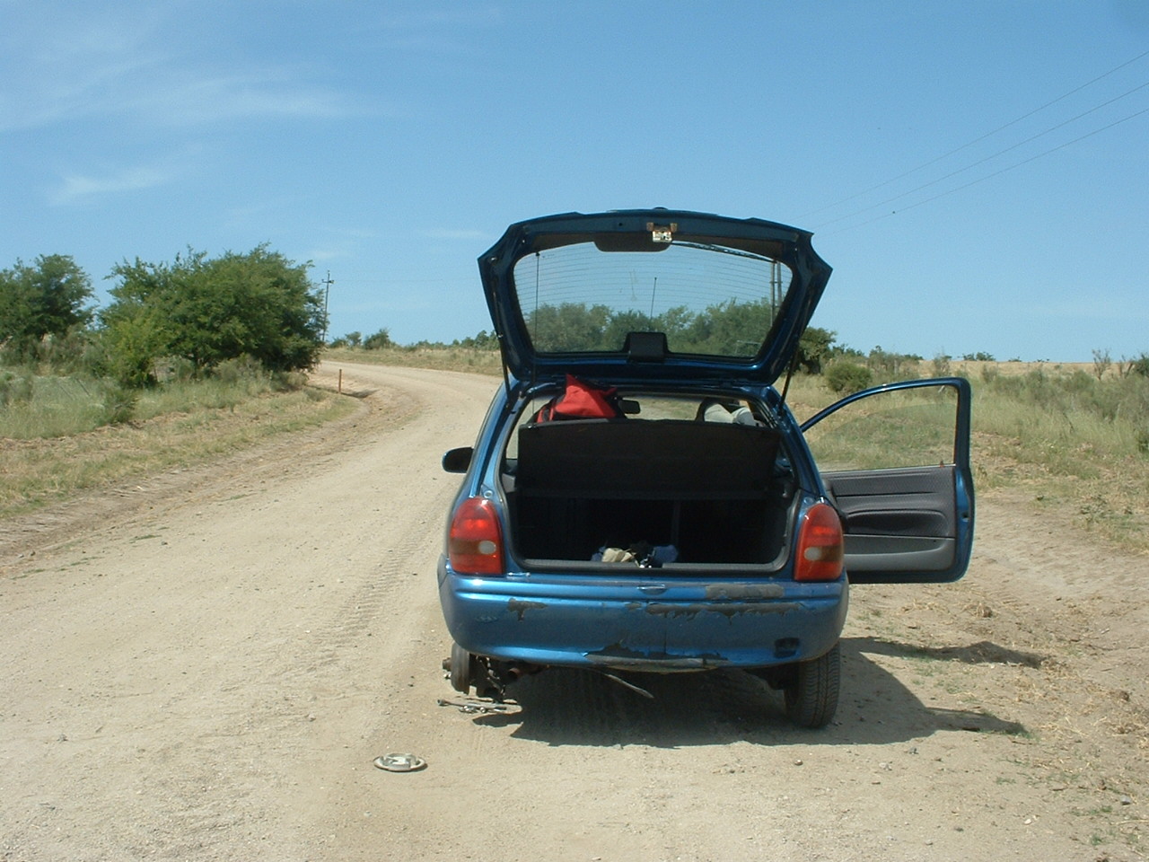 Una afilada piedra pinchó un neumático. El auto en el que viajábamos no era el acostumbrado para estas lides. El cambio había sido hecho poco antes de viajar. No sabíamos si teníamos neumático auxiliar. ¡Había! Pero estaba desinflado.